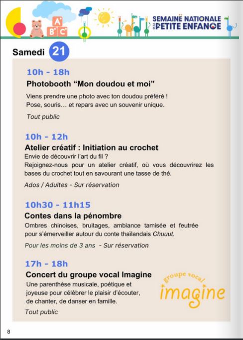 Dans le cadre de la semaine nationale de la petite enfance, rendez vous petits et grands à la médiathèque de Montigny-le-Bretonneux le samedi 21 mars 2026 à 17h pour assister à un concert du Groupe Vocal Imagine. Le programme de la journée est affiché ci-contre.